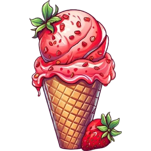 Um sorvete de morango em um cone, com uma bola de sorvete rosa e pedaços de morango, decorado com folhas verdes e um morango ao lado.
