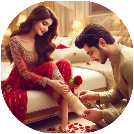 Um homem ajoelhado diante de uma mulher, segurando um pé dela enquanto ela sentada na cama, com uma rosa vermelha. O ambiente é romântico com pétalas de rosa no chão.