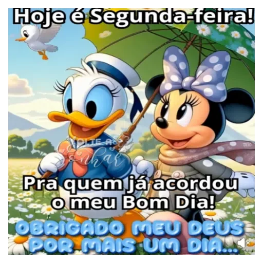 Mickey Mouse vestida de azul com flores e um laço na cabeça, sentada em um tronco com a frase 'Boa Semana' em uma faixa…