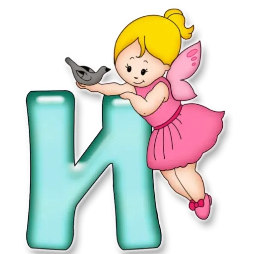 Uma menina fada com cabelo loiro e vestido rosa está ao lado de uma letra 'K' verde, segurando um pássaro cinza.