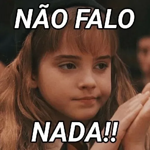 Menina com expressão séria e mãos juntas, dizendo 'Não falo nada!!'