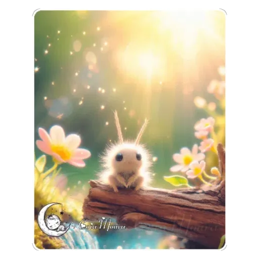 Um pequeno animal fofo com pelos brancos e chifres, sentado em um tronco de madeira cercado por flores e luz solar.