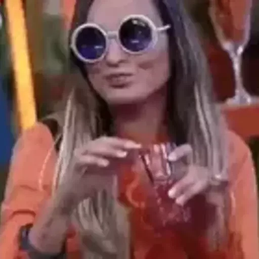 Mulher de óculos de sol redondos e cabelo castanho-claro com mechas loiras, vestindo uma blusa laranja, segura um copo transparente com as mãos.
