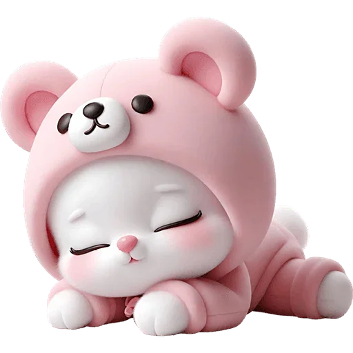 Um gato fofinho rosa com olhos fechados e expressão de sono, vestindo uma roupa de urso.