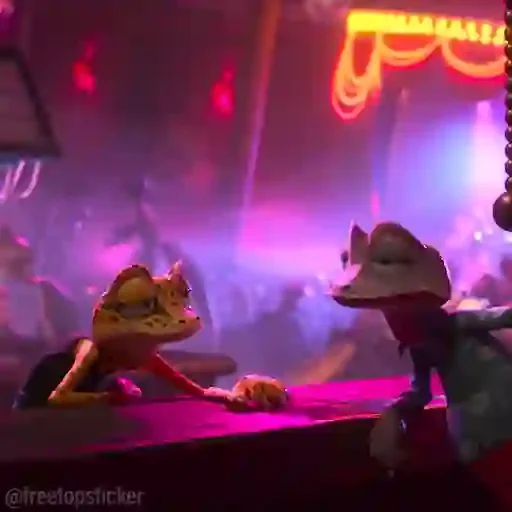 Dois personagens de desenho animado, um laranja e outro verde, sentados em um balcão com luzes de neon rosa ao fundo.