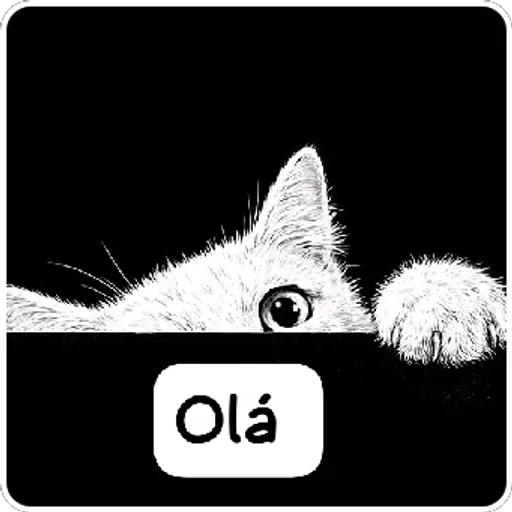 Um gato branco espiando de trás de uma superfície preta com a palavra 'Olá' escrita abaixo.