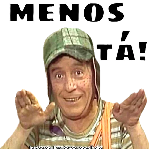 Homem com expressão cética, vestindo uma camisa listrada e um boné verde, com as mãos levantadas e texto 'Menos tá!' em preto.