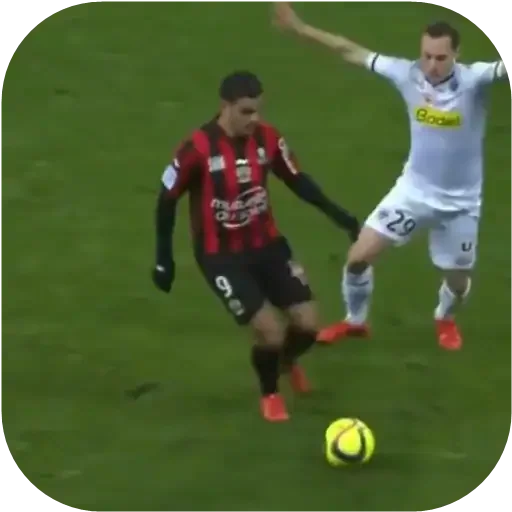 Dois jogadores de futebol disputando uma bola amarela em um campo de grama, um vestindo uniforme vermelho e preto e o outro de branco.