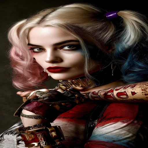 Harley Quinn com penteados laterais, maquiagem colorida e correntes, em um fundo multicolorido.