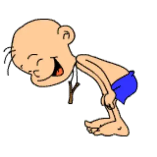 Um menino careca e magro com uma expressão de dor ou desconforto, vestindo shorts azuis, com a mão na barriga e a boca aberta.