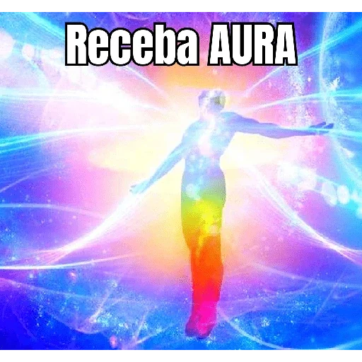 Uma pessoa com os braços abertos está cercada por uma aura colorida e radiante, com o texto 'Receba AURA' na parte superior.