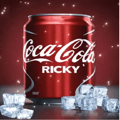Lata de Coca-Cola com o nome Ricky escrita embaixo da marca, rodeada de gelo e faíscas em um fundo vermelho escuro.