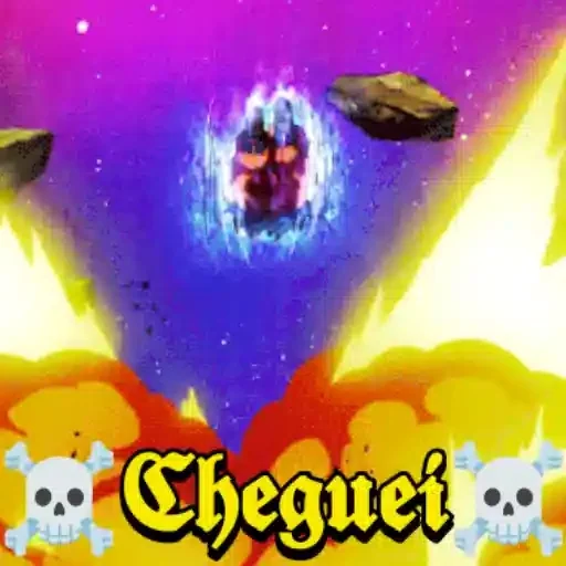 Uma figura sombria com olhos vermelhos surge de uma explosão de luz azul em um fundo roxo e azul estrelado. Rochas flutuam ao redor. A imagem tem esqueletos e a palavra 'Cheguei' em amarelo com contorno preto.