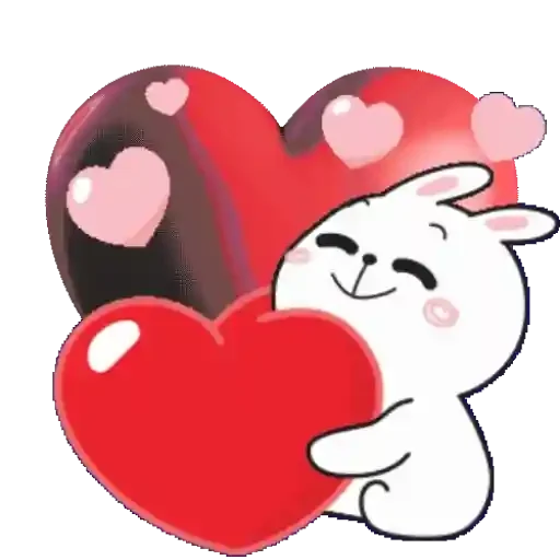 Um coelho branco com olhos fechados e bochechas rosadas abraçando um coração vermelho gigante, com vários corações rosa e vermelhos ao fundo.