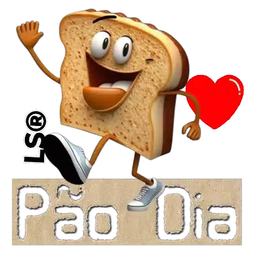 Um pão com pernas e braços, sorrindo e acenando, com um coração vermelho na mão. Abaixo dele, está escrito 'Pão Dia'.