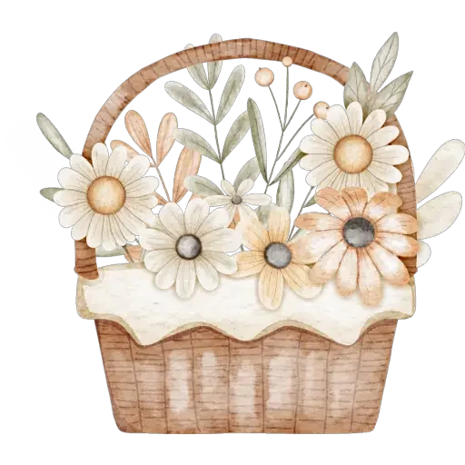 Cesta de vime com flores brancas e begôs, folhas verdes e begas. A cesta tem uma alça e uma borda ondulada.