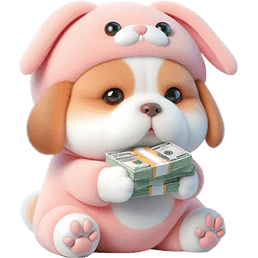 Um cachorro fofinho com pelagem castanha, branca e rosa, vestindo uma fantasia de coelho rosa, segurando uma grande quantia de dinheiro.