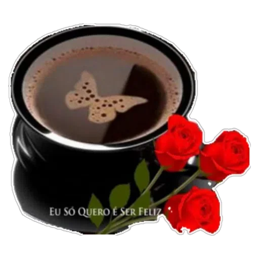 Uma xícara de café com um coração formado por espuma no centro, acompanhada de três rosas vermelhas e o texto 'EU SO QUERO SER FELIZ'