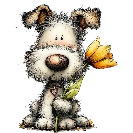 Cachorro fofo com flor amarela, pelagem cinza e branca, orelhas caídas e bochechas rosadas.