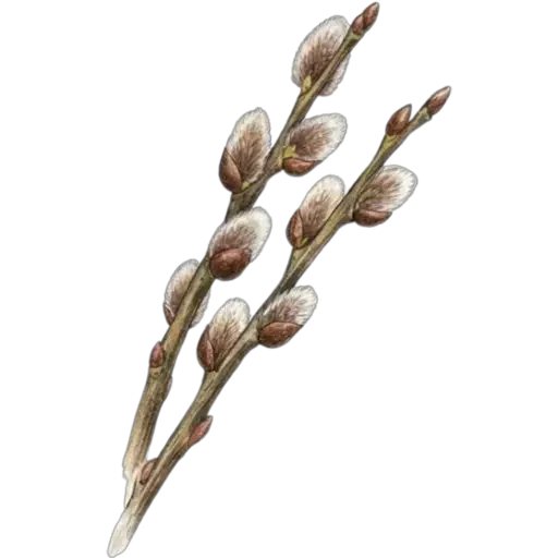 Ramo de salgueiro com botões de flores marrons e verdes.
