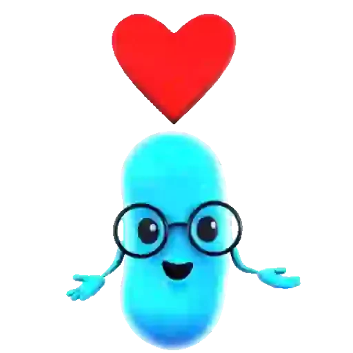 Um personagem azul com óculos e um coração vermelho acima da cabeça.