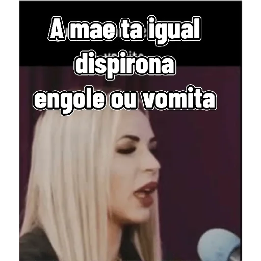Uma mulher loira com a boca aberta, parecendo falar ou cantar, com um microfone à frente. A imagem tem um texto em cima: 'A mae ta igual dispirona engole ou vomita'.