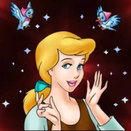 Cinderela com as mãos junto ao rosto e expressão surpresa, vestindo um vestido azul claro e fundo vermelho com estrelas…