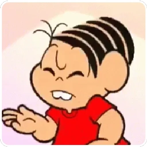 Menino de cabelo preto e camisa vermelha fazendo um gesto com a mão e expressão facial de desconfiança ou surpresa.