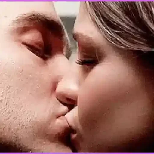 Um casal se beijando, com os olhos fechados e rostos próximos.