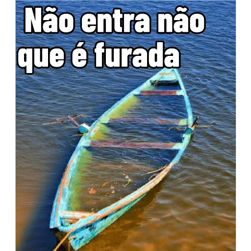 Barca azul com várias remadas e uma corda, boiando na água com a frase 'Não entra não que é furada' em cima.
