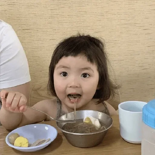 Menina sentada à mesa comendo, com uma colher na mão e uma tigela de comida na frente. Ela parece surpresa ou assustada.