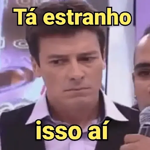 Homem com expressão de desconfiança, texto 'Tá estranho isso aí' em amarelo.