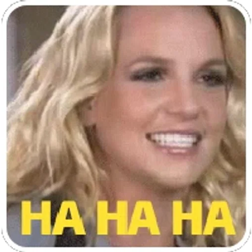 Uma mulher loira com um sorriso largo e dentes brancos, olhos castanhos e cabelo ondulado, com o texto 'HA HA HA' em amarelo na parte inferior.