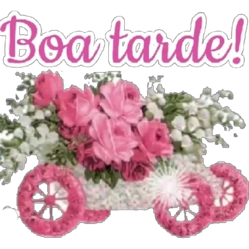 Um carrinho de flores rosadas e brancas com a frase 'Boa tarde!' em letras rosadas.