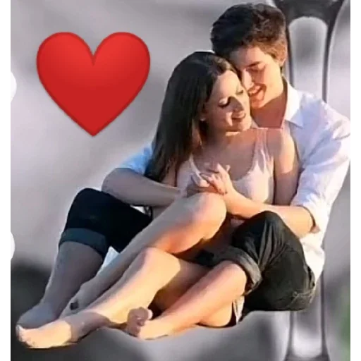 Um casal abraçado com um coração vermelho ao lado. O homem tem cabelo preto e camisa branca, e a mulher tem cabelo castanho e uma blusa clara.