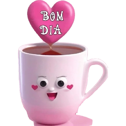 Um bule de chá rosa com um coração e o texto 'Bom Dia' boiando dentro, com um rosto feliz e dois corações nas bochechas.