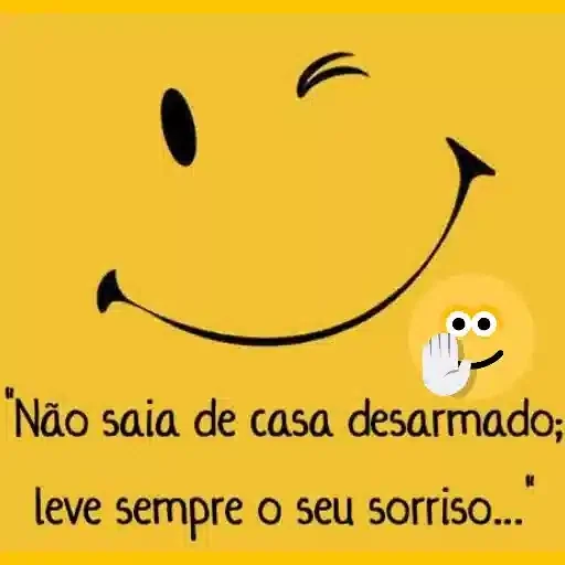 Um sorriso amarelo com um olho e uma sobrancelha, acompanhado de uma mão com a palma para frente e o texto 'Não saia de casa desarmado; leve sempre o seu sorriso...'