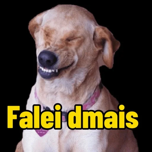 Um cachorro com um colar rosa e um sorriso forçado, com os olhos fechados e texto 'Falei dmais' em amarelo.