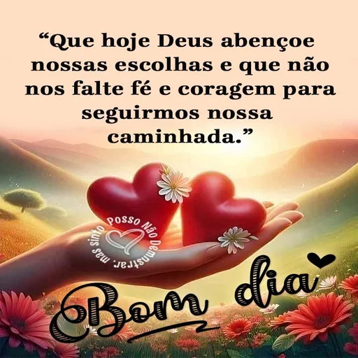 Mão segurando dois corações vermelhos com flores sobre um cenário de montanhas ao pôr do sol. Frase 'Que hoje Deus abençoe nossas escolhas e que não nos falte fé e coragem para seguirmos nossa caminhada.' e 'Bom dia' escritos em preto.