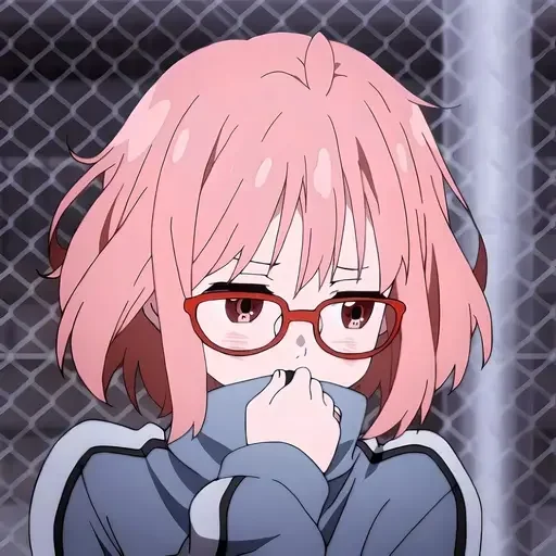 Garota de anime com cabelo rosa e óculos vermelhos fazendo careta, com uma cerca de metal ao fundo.