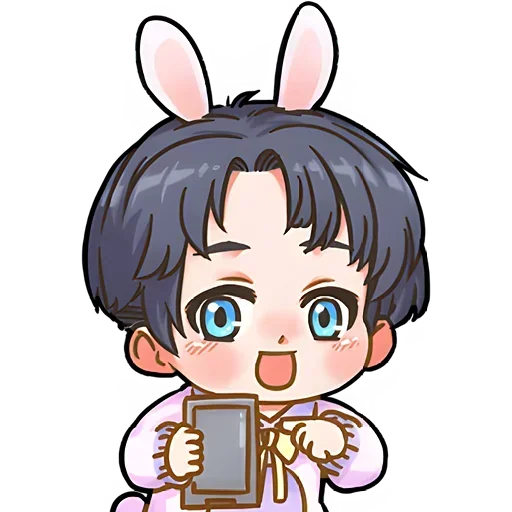 Menino de anime com orelhas de coelho, cabelo preto e olhos azuis, segurando um quadro em branco.