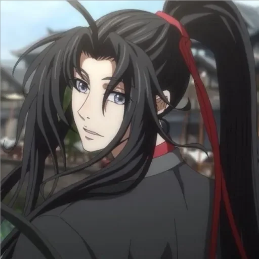 Personagem de anime com cabelo preto e longo, olhar sério e roupa preta. Fundo desfocado com construções.