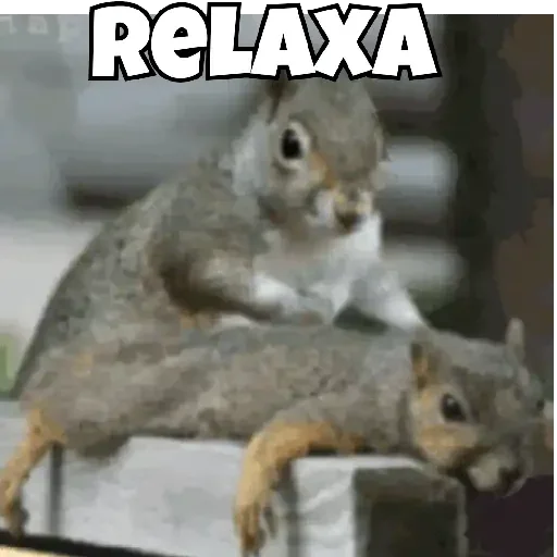 Dois esquilos cinzas com expressão relaxada, um em cima do outro, com a palavra 'RELAXA' em letras grandes e brancas acima deles.