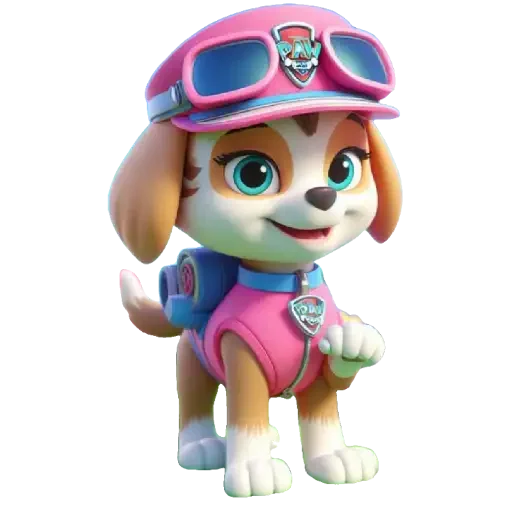 Cachorro fofinho com capacete rosa e óculos de sol, de um desenho animado.