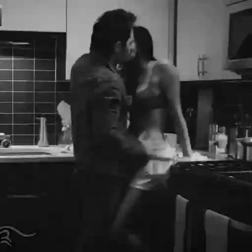 Cena de um casal em um ambiente doméstico, com o homem e a mulher próximos, em uma cozinha com azulejos pretos.