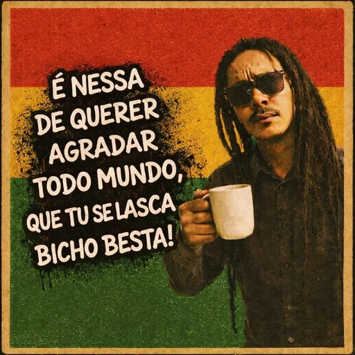 Um homem com dreadlocks e óculos escuros segura uma xícara de café em frente a um fundo colorido com as cores vermelho, amarelo e verde. Ele veste uma camisa preta. Há um texto em preto com letras brancas que diz: 'É NESSA DE QUERER AGRADAR TODO MUNDO, QUE TU SE LASCA BICHO BESTA!'