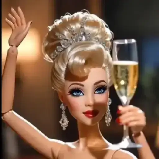 Uma mulher loira com um penteado elaborado e uma taça de champanhe na mão, com um braço levantado em celebração. Ela parece estar usando um vestido e tem uma expressão feliz.