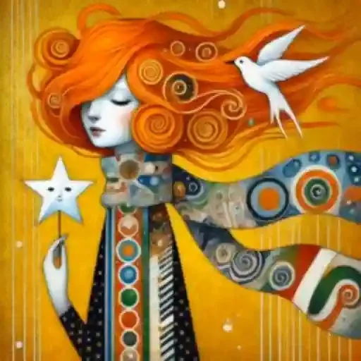Mulher com cabelos laranjas encaracolados e olhos fechados segura uma estrela na mão esquerda, enquanto um pássaro branco voa ao lado de sua cabeça. Ela veste uma roupa colorida com padrões geométricos.