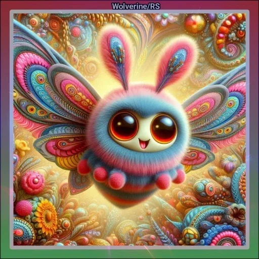 Uma criatura colorida com orelhas de coelho e asas de borboleta, com olhos grandes e brilhantes, em um fundo floral psicodélico.