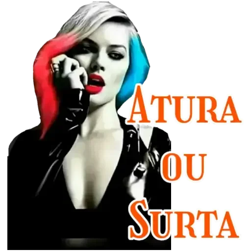 Mulher com metade do cabelo vermelho e metade azul, maquiagem pesada, lábios vermelhos e luva preta, com o texto 'ATURA OU SURTA' ao lado.